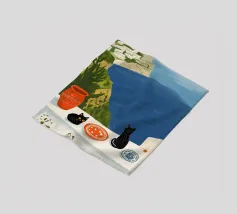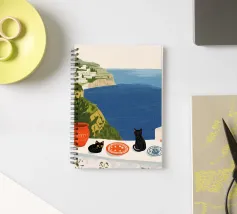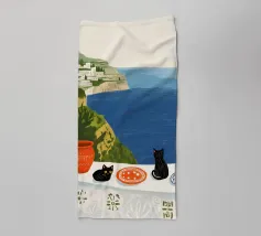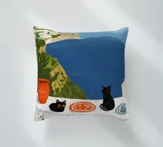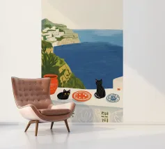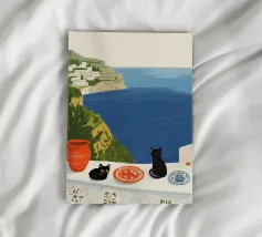 L'immagine mostra un paesaggio costiero mediterraneo con case bianche disposte a terrazza su un pendio verde che si affaccia sul mare blu intenso. In primo piano, due gatti neri siedono su una superficie bianca, circondati da piatti decorativi e da una pentola di terracotta rossa: un momento tranquillo e pieno di fascino.