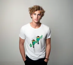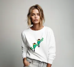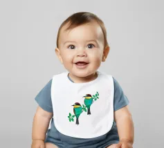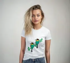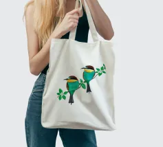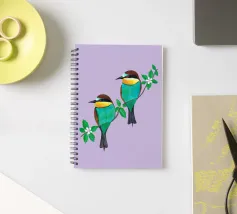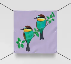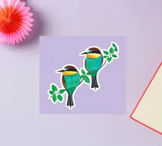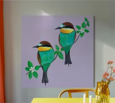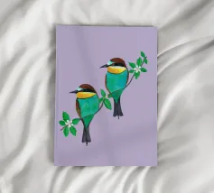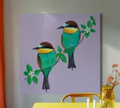 Un dipinto ad inchiostro acrilico raffigurante due gruccioni seduti su un ramo con foglie e fiori rosa. Sono in posizione rilassata ed entrambi guardano a sinistra.