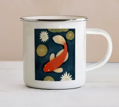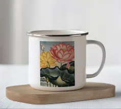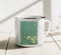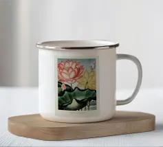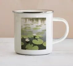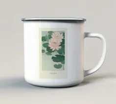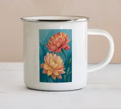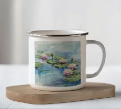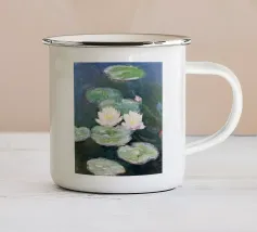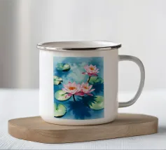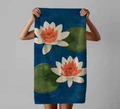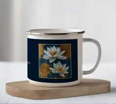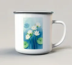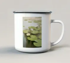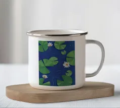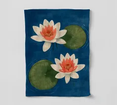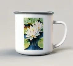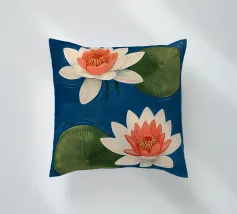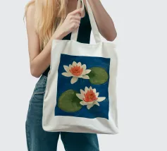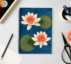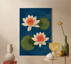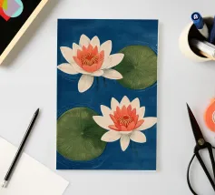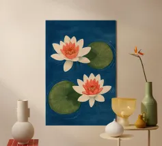 L'immagine mostra due eleganti fiori di ninfea con petali esterni bianchi e interni arancioni, accompagnati da foglie verdi e rotonde di ninfea su una superficie d'acqua scura. Lo sfondo scuro mette in risalto i colori vivaci dei fiori e delle foglie. Stilisticamente, l'illustrazione è dettagliata e ricca di texture, con un'attenzione particolare ai contrasti di colore e alle forme morbide e naturali. Un gioco estetico di calma e intensità cromatica.