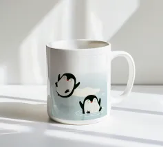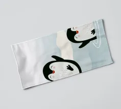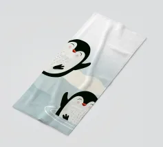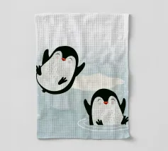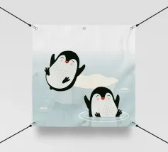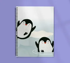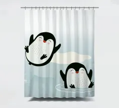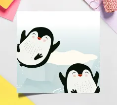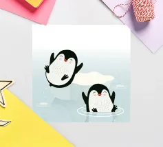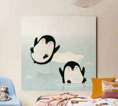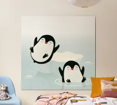 Pinguini felici si godono l'acqua fredda in un pittoresco scenario artico. Un motivo giocoso e vivace che cattura la gioia e la vitalità del mondo animale.Due pinguini felici in movimento