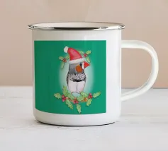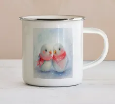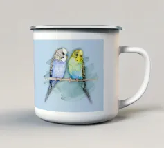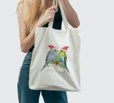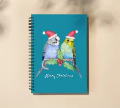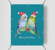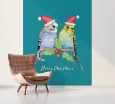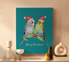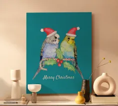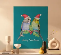 Disegno ad acquerello di due simpatici pappagallini in stile natalizio. L'uccello di sinistra ha il ventre blu e la fronte bianca ed è un maschio. Entrambi indossano cappelli da Babbo Natale e sono appollaiati su un bastoncino di zucchero decorato con agrifoglio. Sotto il testo "Buon Natale". Coppia simpaticissima.