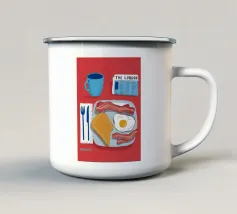 Una composizione minimalista per la colazione con uova fritte e pancetta croccante brilla su un piatto su uno sfondo giallo. Questa illustrazione creativa celebra il piacere di ingredienti sani e biologici e la gioia del mattino!