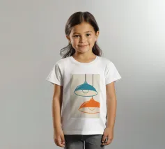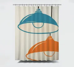 Un'illustrazione moderna e grafica di due lampade a sospensione, una turchese e una arancione. Le linee semplici e pulite e lo stile a blocchi di colore ne fanno un'opera d'arte decorativa chic e contemporanea.