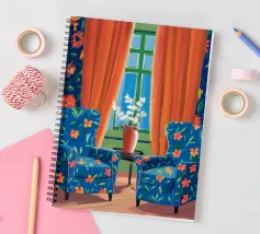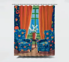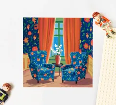 Una scena d'interni con due poltrone rivestite in un vivace tessuto floreale arancione, accanto a una finestra con tende fluenti. La stanza è una celebrazione audace, bella e invitante di motivi e colori.