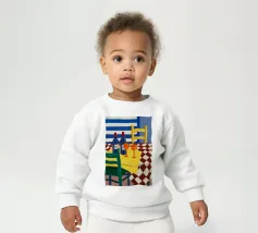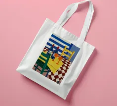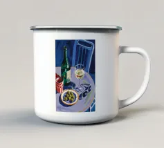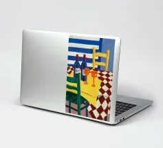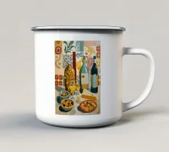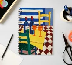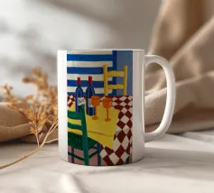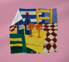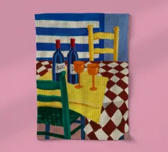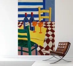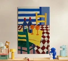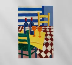 Una giocosa natura morta con due bicchieri di vino e due bottiglie su una tovaglia a scacchi gialli e bianchi. Due sedie verdi sono accostate al tavolo, creando una scena invitante su uno sfondo blu a righe.