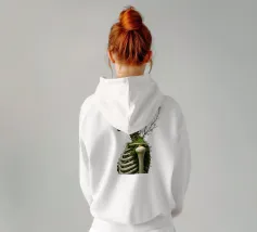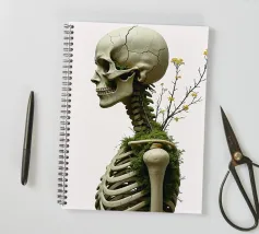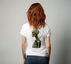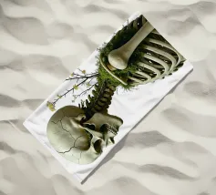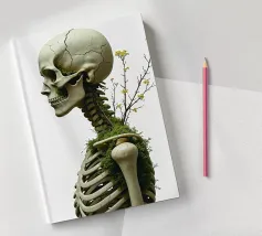 Dal cranio fratturato alla clavicola, il muschio reclama ciò che il tempo ha dimenticato. I fiori gialli nascono dall'osso e si arricciano sulla spalla come una resistenza silenziosa. Lo scheletro non si piega né in avanti né indietro: sta semplicemente in piedi. Non ha chiesto questo giardino, ma lo ha tenuto in vita.