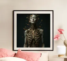 Dal cranio fratturato alla clavicola, il muschio reclama ciò che il tempo ha dimenticato. I fiori gialli nascono dall'osso e si arricciano sulla spalla come una resistenza silenziosa. Lo scheletro non si piega né in avanti né indietro: sta semplicemente in piedi. Non ha chiesto questo giardino, ma lo ha tenuto in vita.