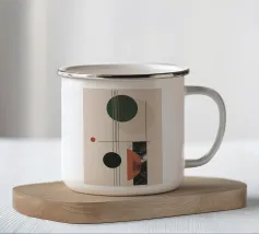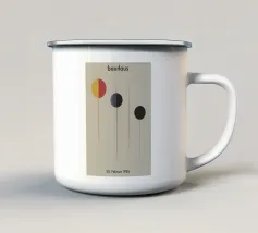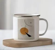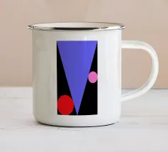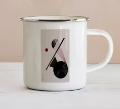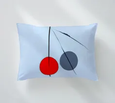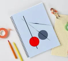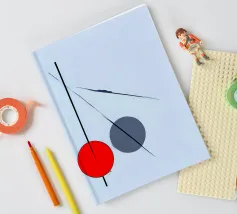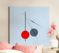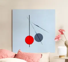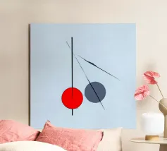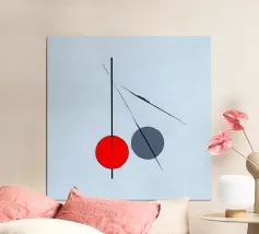 Questo dipinto è un'opera minimalista e astratta con pochi e precisi elementi su uno sfondo azzurro o quasi bianco. La composizione mostra una spessa linea nera verticale che penetra in un cerchio rosso vivo nella parte inferiore. Alla sua destra si trova un cerchio grigio. Linee nere sottili e fini attraversano diagonalmente l'immagine e il cerchio grigio. La disposizione è grafica e ricorda le note musicali, i simboli chimici o una rappresentazione molto ridotta della frutta.