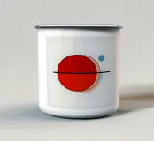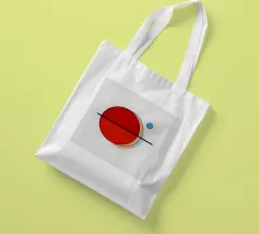Questa immagine rigorosamente geometrica e minimalista mostra un grande cerchio centrale di colore rosso vivo, intersecato da una spessa linea nera orizzontale. Il cerchio rosso è circondato da forme sottilmente accennate e semitrasparenti in rosa chiaro e blu, che creano un senso di profondità. In alto a destra, al di fuori del cerchio principale, si trova un punto blu più piccolo e non collegato. La composizione è precisa e statica, isolata su uno sfondo neutro grigio chiaro.
