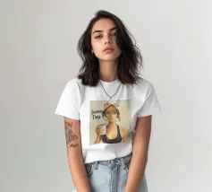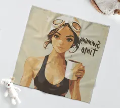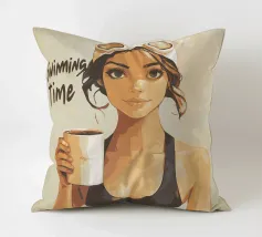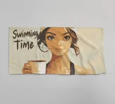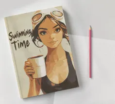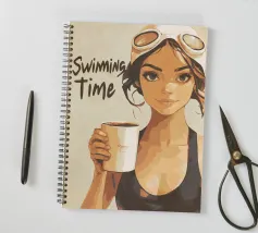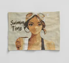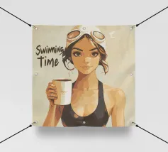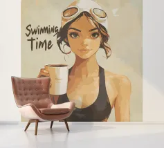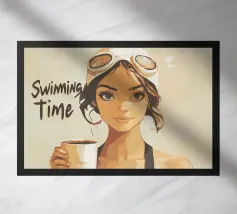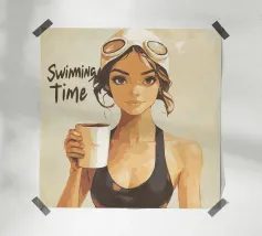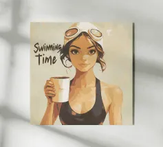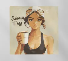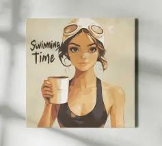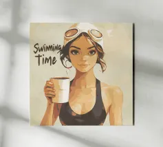 Una vivace illustrazione di una ragazza determinata, pronta a tuffarsi in acqua. Stringe una tazza con la scritta "Swimming Time", che esprime la sua passione per questo sport. Il dipinto evoca l'energia, l'attesa e la serenità del nuoto, fondendo il movimento dinamico con un tocco di rituale personale.