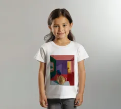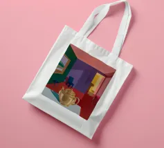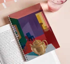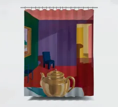 Una teiera dorata incastonata in un'architettura spigolosa e dai toni decisi suggerisce una tranquilla contemplazione e un mistero di metà secolo.