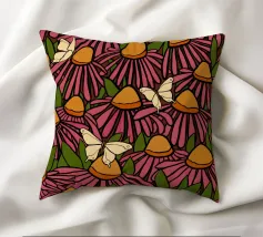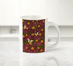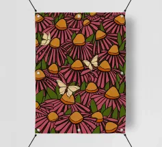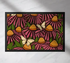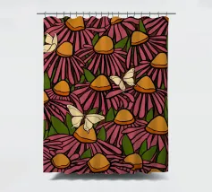 Una nostalgica illustrazione digitale a olio di un campo di fiori di echinacea con tre graziose farfalle bianche. Creata in stile retrò con toni lunatici e contorni neri decisi, che richiamano il fascino dei fumetti d'epoca.