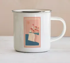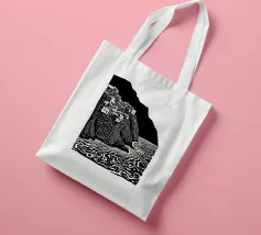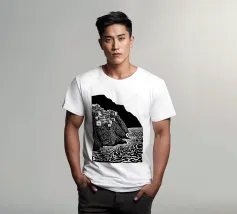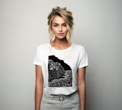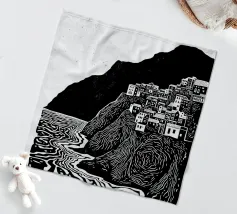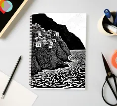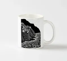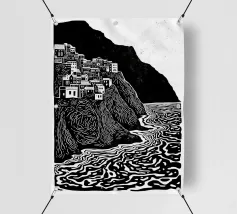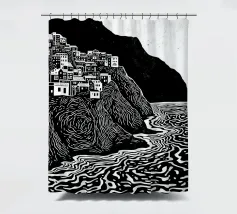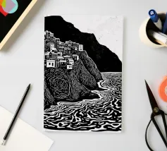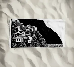 Una suggestiva illustrazione in bianco e nero in stile linoleografico che raffigura un villaggio costiero arroccato su ripide scogliere, affacciato su un mare vorticoso e ricco di sfumature. L'intricato lavoro al tratto crea un effetto dinamico e quasi ipnotico, enfatizzando il contrasto tra il paesaggio aspro e gli edifici strutturati.
