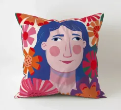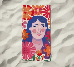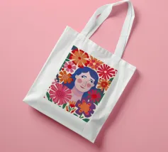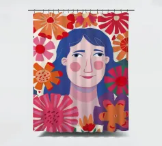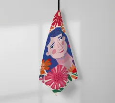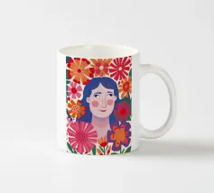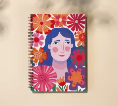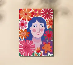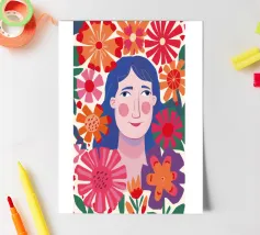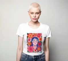Una persona con i capelli corti indossa una vestaglia floreale rossa e bianca e culla delicatamente un vaso di orchidee. Lo sfondo verde tenue crea un senso di calma ed eleganza.