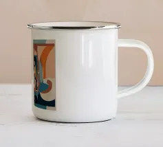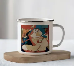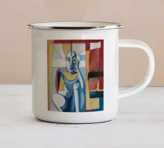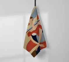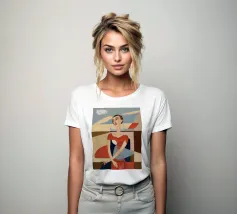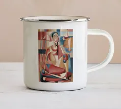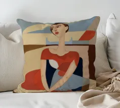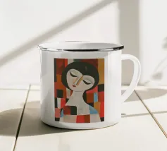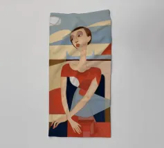 Quest'opera d'arte raffigura una figura in posa composta ed elegante, circondata da forme e colori astratti. La composizione sottolinea la grazia e la raffinatezza della figura.
