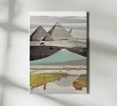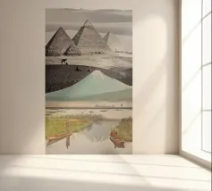 Un terreno da sogno cucito dal tempo e dal mito: All At Once fonde tre paesaggi iconici in un mondo surreale e senza luogo. Il tranquillo specchio del Monte Fuji di Kashiwabara (1896, Kazumasa Ogawa) si innalza nella silhouette delle Piramidi di El-Geezeh di Frith del 1858, il tutto coronato dalle eteree dune di White Sands, nel Nuovo Messico, catturate dalla NASA. Insieme, queste scene dissolvono la geografia e la cronologia per evocare una tranquilla meraviglia cinematografica, dove vulcani e faraoni si incontrano davanti a dune simili a nuvole. Un portale per il muro e un pellegrinaggio per l'occhio.