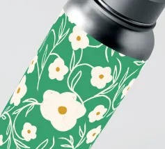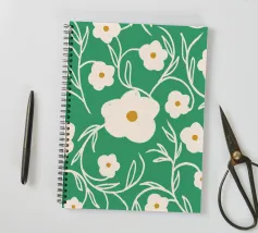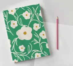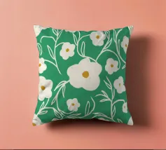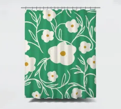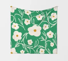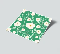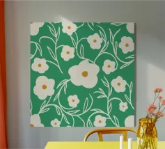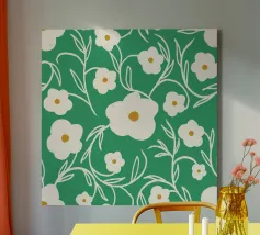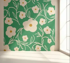 Un allegro motivo floreale astratto che presenta capricciose margherite bianche con centro giallo oro, su uno sfondo verde smeraldo. Ispirato al minimalismo scandinavo, all'estetica moderna di metà secolo e al fascino boho, questo disegno fresco e vivace si adatta perfettamente agli interni contemporanei, ai tessuti e all'arredamento eclettico.