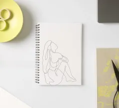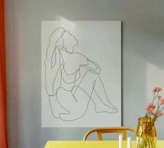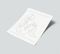 Un disegno al tratto minimalista di una figura nuda seduta con i capelli voluminosi e fluenti che scendono lungo la schiena. Questa tranquilla composizione cattura l'immobilità e la sensualità in un unico tratto: una celebrazione della forma femminile attraverso la morbidezza, la semplicità e la forza sottile.