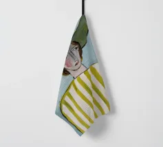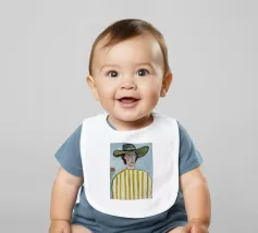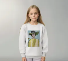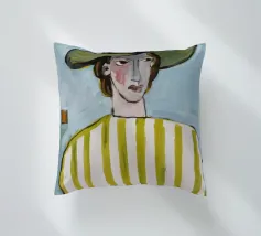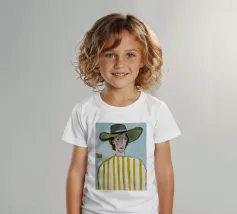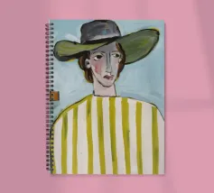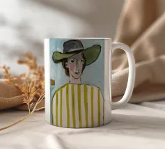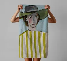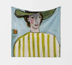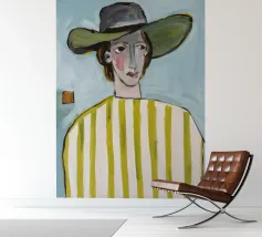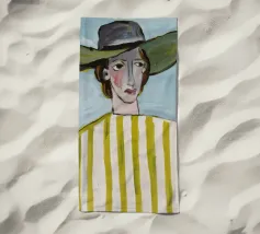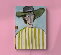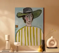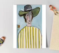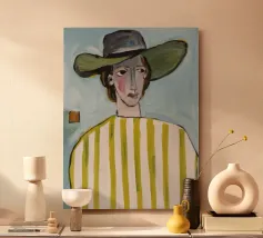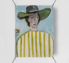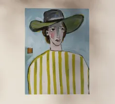 Questo dipinto raffigura una figura che indossa un cappello verde, con una camicia a righe e uno sfondo semplice. L'uso di colori tenui e di linee pulite conferisce all'opera una qualità minimalista ma intrigante.