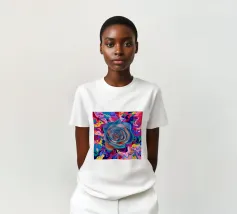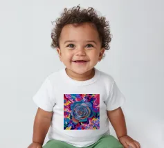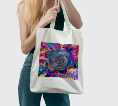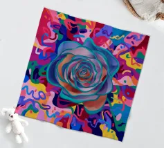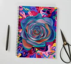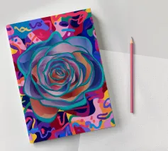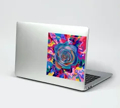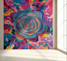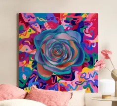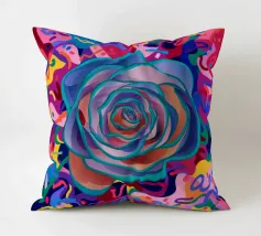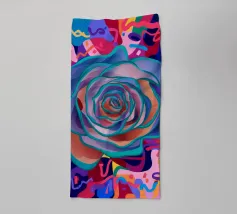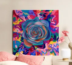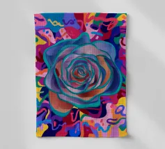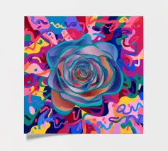 Una suggestiva rappresentazione astratta di una rosa nei toni del rosso e del blu intenso, con intricati petali sovrapposti. I colori vibranti e le forme stratificate creano un senso di mistero e profondità in un contesto floreale.