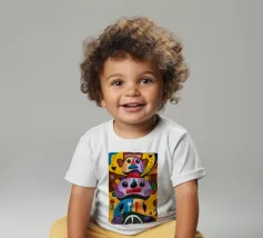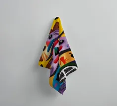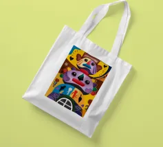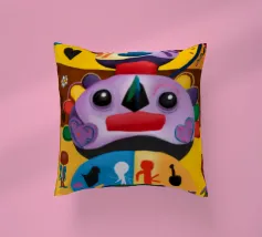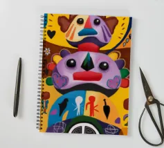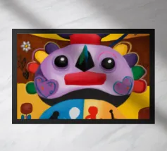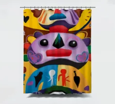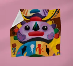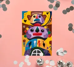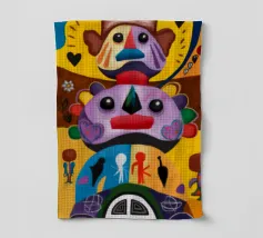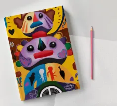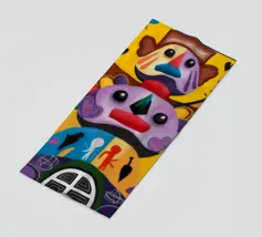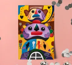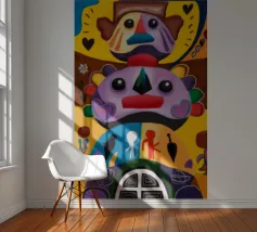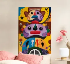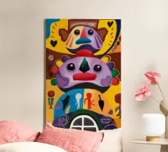 Una serie di volti astratti disposti in una struttura simile a un totem. Ogni volto è stilizzato in modo unico, mescolando disegni geometrici e colori vivaci.