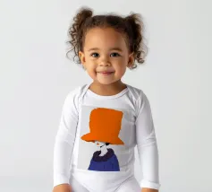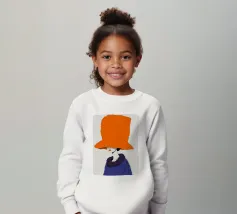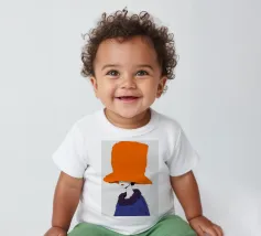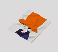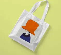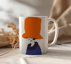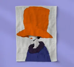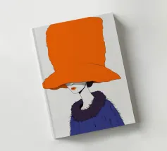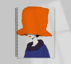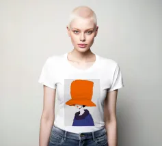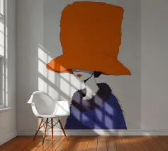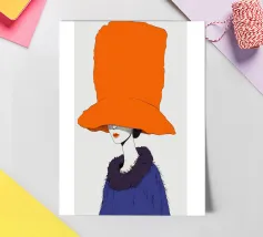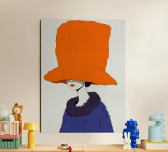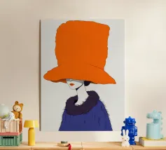Un ritratto misterioso e di alta moda di una donna il cui volto è oscurato da un grande e drammatico cappello arancione. La composizione è enigmatica, elegante e rappresenta un'audace dichiarazione sulla moda e sull'identità.