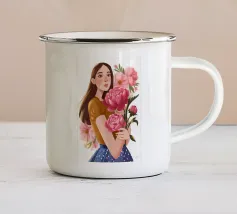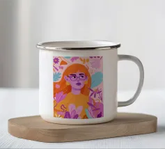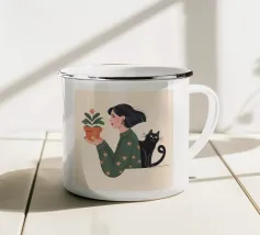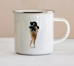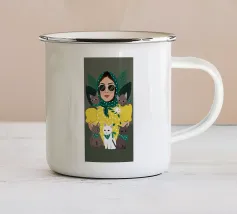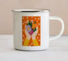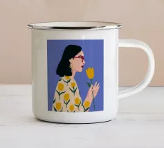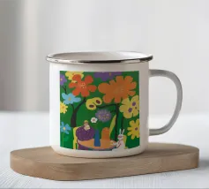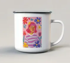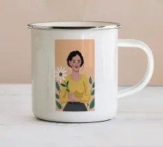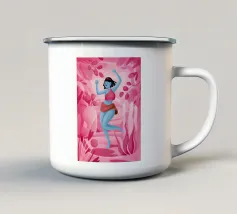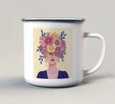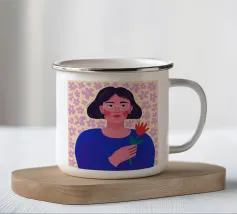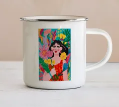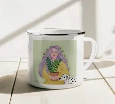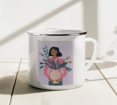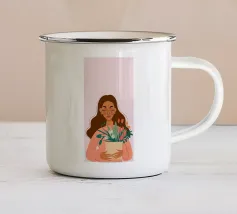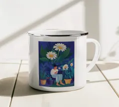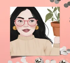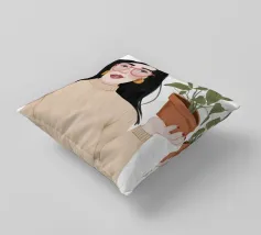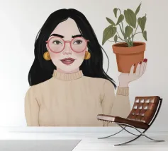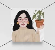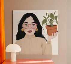 L'opera raffigura una figura che tiene in una mano una pianta in vaso. La figura indossa un maglione beige e lo sfondo è minimalista, sottolineando l'equilibrio tra natura e presenza umana.