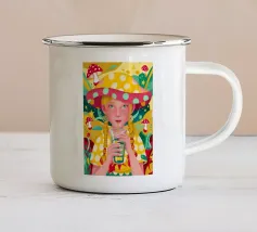 L'opera raffigura una figura che tiene in una mano una pianta in vaso. La figura indossa un maglione beige e lo sfondo è minimalista, sottolineando l'equilibrio tra natura e presenza umana.