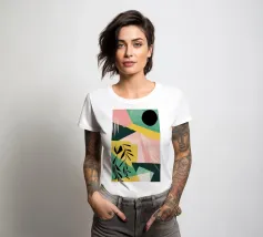 Una composizione minimalista ma audace mette in equilibrio una foglia verde stilizzata con forme nere e fantasia su uno sfondo pastello, creando un pezzo botanico astratto moderno e sofisticato.
