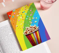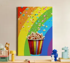 Questa coloratissima opera d'arte è piena di energia, gioia di vivere e un tocco di pop art. Un secchio di popcorn sovradimensionato è al centro della scena, facendo roteare i suoi chicchi colorati su uno sfondo di colori dell'arcobaleno e coriandoli. Il display luminoso mette di buon umore qualsiasi ambiente e ricorda le visite spensierate al cinema, le feste esuberanti o il divertimento infantile delle piccole cose. Ideale per tutti coloro che amano il colore, la cultura pop e il design giocoso. Si adatta perfettamente alle stanze dei giovani, agli home cinema, agli spazi di lavoro creativi o a qualsiasi luogo in cui si desideri gioia e leggerezza.
