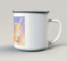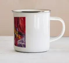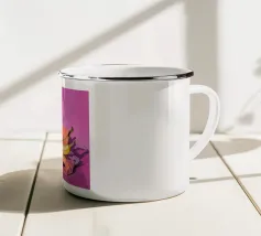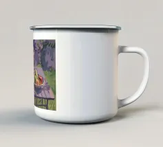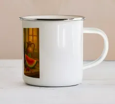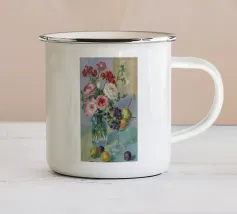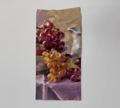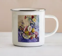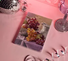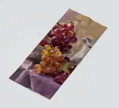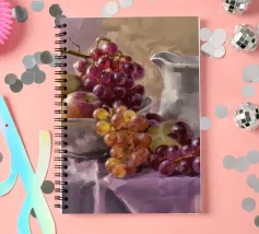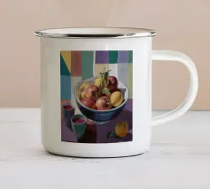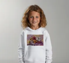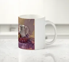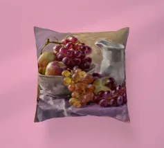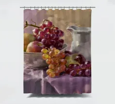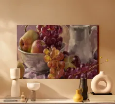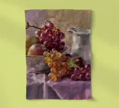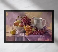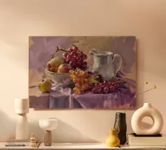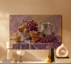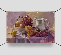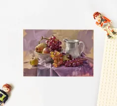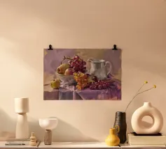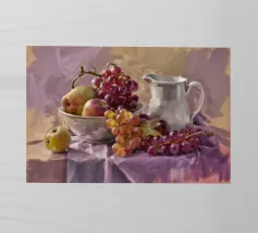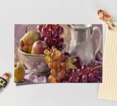Una natura morta che mostra una brocca di porcellana bianca o una caffettiera accanto a una ciotola piena di uva, mele e pere. La composizione si trova su un drappo viola con uno sfondo tenue.