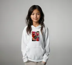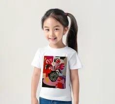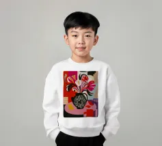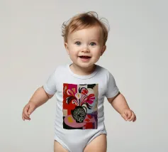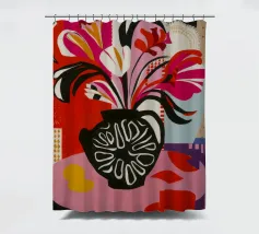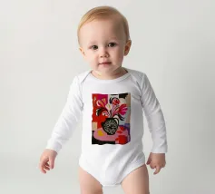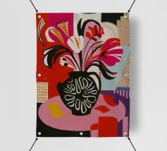 Un'opera altamente astratta ed espressiva, caratterizzata da forme floreali e motivi audaci. Un vaso nero con segni gestuali sostiene un bouquet caotico su uno sfondo di forme beige, rosse e nere, creando una dichiarazione potente e moderna.