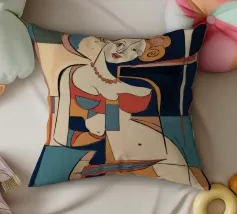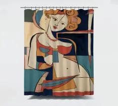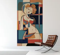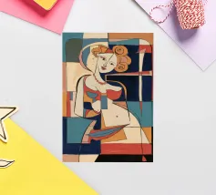 Questo dipinto raffigura una figura in posa giocosa, circondata da forme geometriche e colori vivaci. La composizione evidenzia la gioia e la spontaneità della scena.