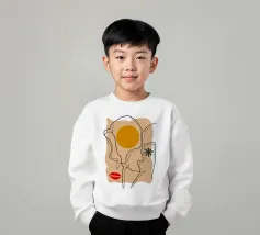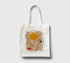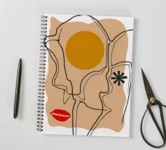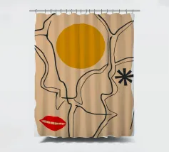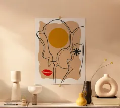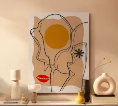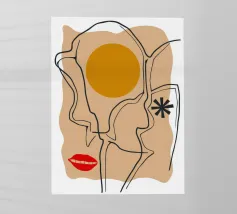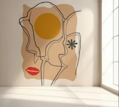 Un disegno a linee continue crea un volto astratto con labbra rosse e una stella, che si sovrappone a una forma di sole su uno sfondo strutturato, fondendo minimalismo e surrealismo.