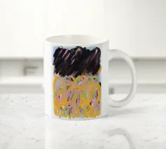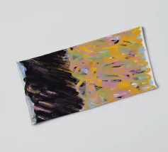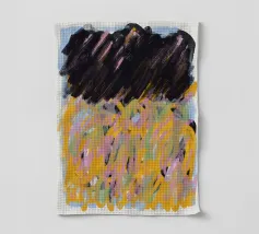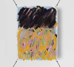 Vibranti pennellate di giallo, rosa e blu danzano sul primo piano, in contrasto con le sbavature scure che dominano la parte superiore dell'opera. La composizione appare spontanea, con una qualità energica ed espressiva che suggerisce un'attenzione al movimento e al gioco dei colori.