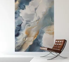 Un lussuoso pezzo astratto con motivi vorticosi di grigi, bianchi e blu profondi, splendidamente intrecciati con venature di oro scintillante. La composizione imita l'elegante bellezza del marmo naturale.