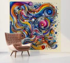 Nel quadro ci sono forme e colori che non si trovano subito. Giocoso e astratto, è un'opera d'arte colorata.