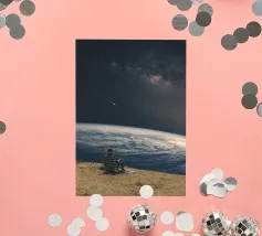 Un collage digitale surreale che mostra una persona sola seduta su una sedia ai confini del mondo, che fissa lo spazio profondo. La Terra si curva sotto di loro, una stella cadente taglia il cielo. Un momento di distacco, di allontanamento dal rumore, dal caos e dalle aspettative, per respirare e osservare l'universo.
