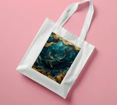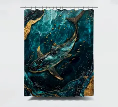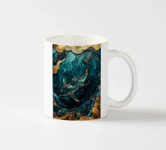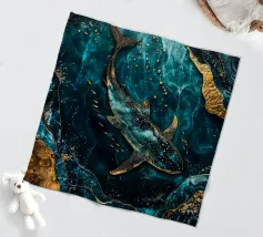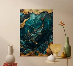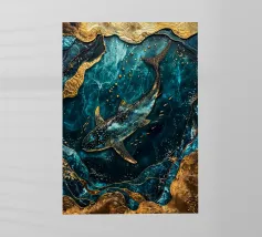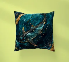 Le correnti dorate dell'oceano cullano un maestoso squalo balena, i cui disegni scintillanti imitano le stelle, come se l'universo stesso avesse dato forma a questa maestosa creatura degli abissi.