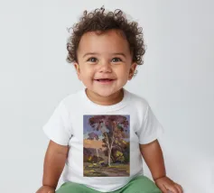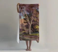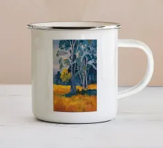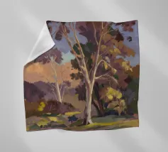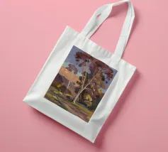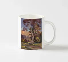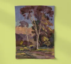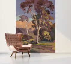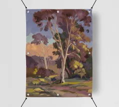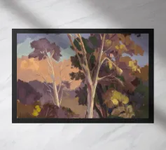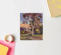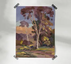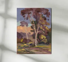 Paesaggio dipinto con alti alberi di eucalipto o simili, con tronchi marrone rossastro e rade chiome verdi e gialle. Lo sfondo è una vaga miscela di blu e viola.