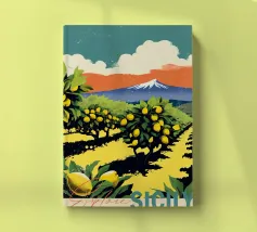 Un poster di viaggio in stile vintage che cattura l'essenza della Sicilia, con vibranti limoneti in primo piano e il maestoso Monte Etna sullo sfondo. La ricca tavolozza di colori e l'audace composizione evocano il calore e la bellezza dell'isola mediterranea.