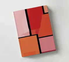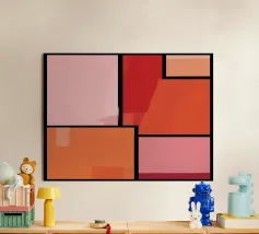 Questo quadro astratto geometrico è una composizione rigorosamente strutturata di aree rettangolari di colore separate da spesse linee nere, simili a un mosaico o a una finestra. La tavolozza dei colori si concentra su toni caldi e terrosi: varie tonalità di rosa, salmone, rosso e arancione, con alcune aree che mostrano sottili sovrapposizioni e texture. La disposizione è asimmetrica e ricorda il movimento De Stijl, ma con una scelta di colori più morbida. L'opera emana calma ed equilibrio, nonostante i confini netti e rigidi.