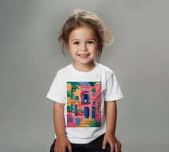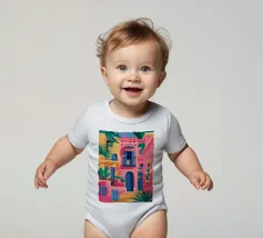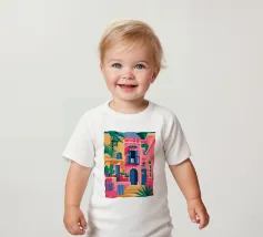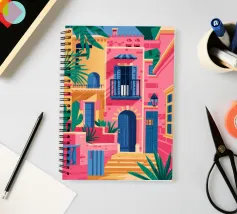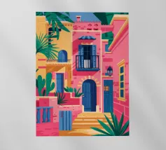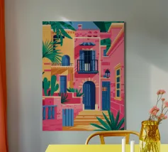 La vibrante facciata di un edificio, dipinta nei toni del rosa e dell'indaco, è ornata da piante e fiori verdi che si arrampicano sulle pareti, mettendo in mostra un dettaglio architettonico ricco e colorato.