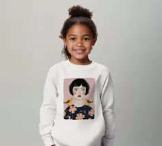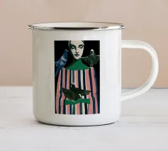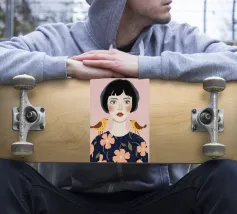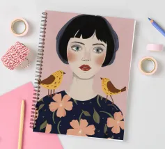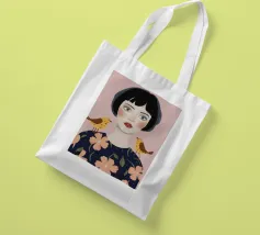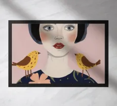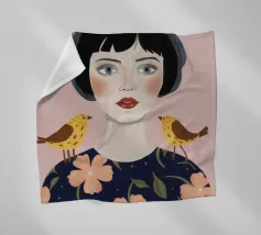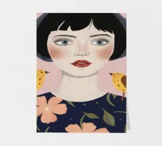 Un ritratto dolce e stravagante di una donna dai capelli corti e scuri e dalle guance rosee, con due uccellini appollaiati sulle spalle come se condividessero dei segreti.