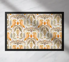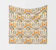Armonioso motivo senza cuciture con pappagalli arancioni, foglie di monstera ed elementi floreali nei caldi toni del beige, del marrone e dell'arancione. Elegante motivo tropicale boho,