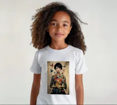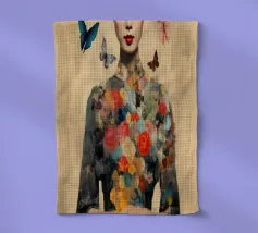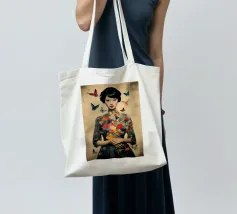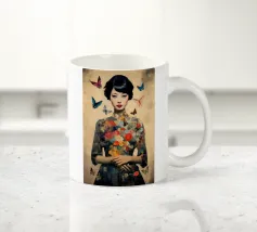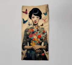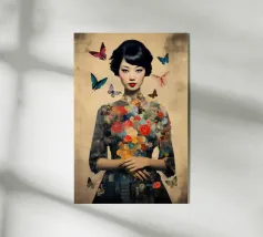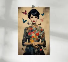 Collage di una donna asiatica con fiori circondata da farfalle