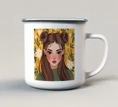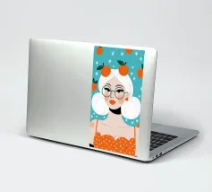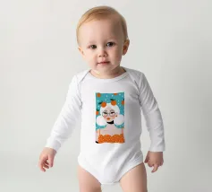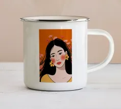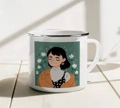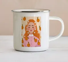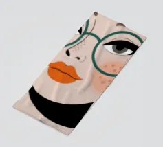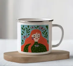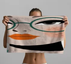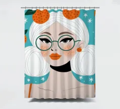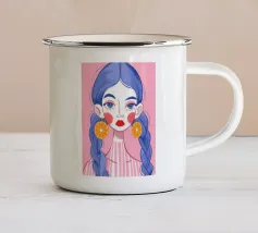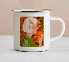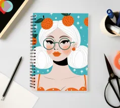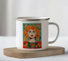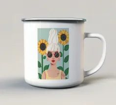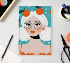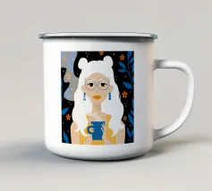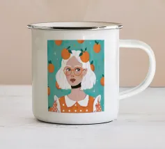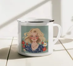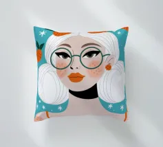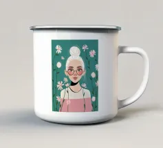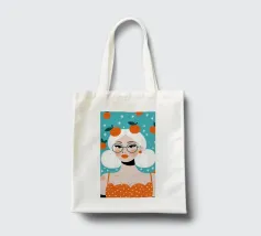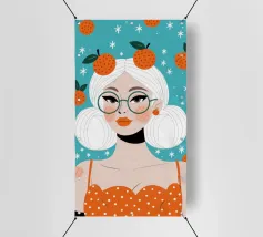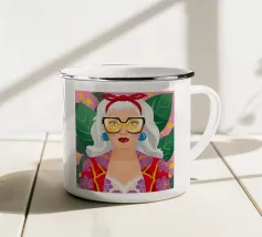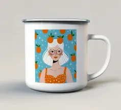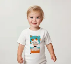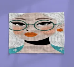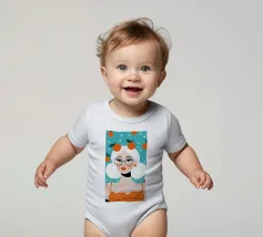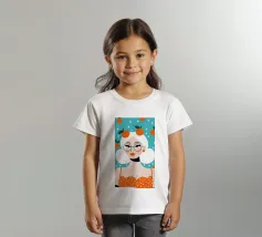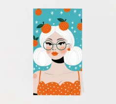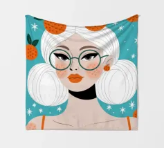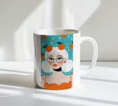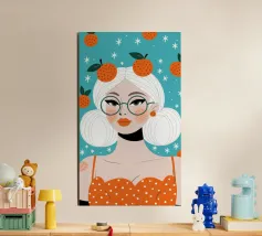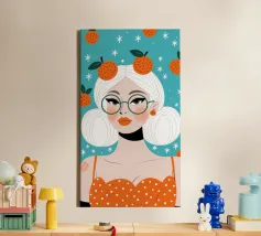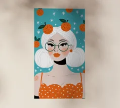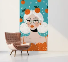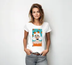 Una persona con i capelli bianchi acconciati in modo retrò indossa un abito a pois, su uno sfondo blu con puntini arancioni, creando un'atmosfera giocosa e nostalgica.