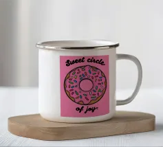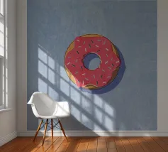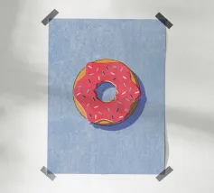 Questo design allegro e di ispirazione retrò presenta una ciambella con glassa rosa e zuccherini colorati su uno sfondo azzurro. Le linee pulite e la morbida texture vintage conferiscono all'immagine un'estetica nostalgica che richiama la cultura dei diner americani e la pop art. Perfetto per gli amanti dei dolci e dello stile retrò, ideale come elemento decorativo colorato per la cucina o il bar.