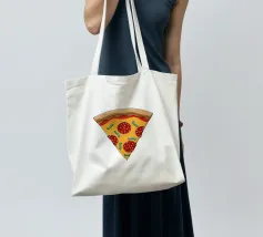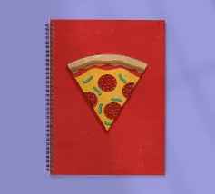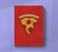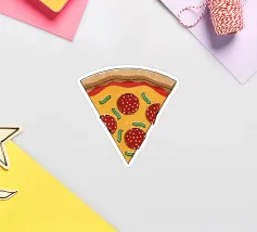 Un'unica fetta di pizza raffigurata graficamente con strisce di salame e peperoni verdi su un deciso sfondo rosso. La combinazione di colori retrò e le forme semplici conferiscono al disegno un'estetica giocosa e nostalgica che ricorda la classica grafica pubblicitaria. Perfetto per gli amanti del fast food e della pop art e ideale come elemento decorativo in cucine o zone pranzo.