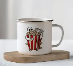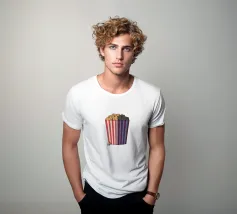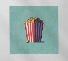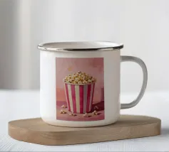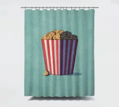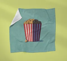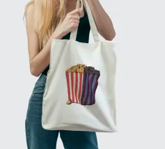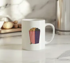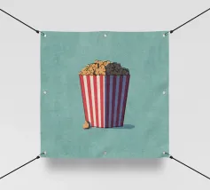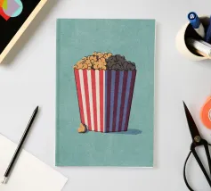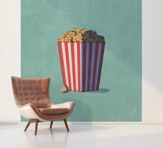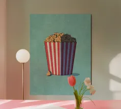 Un nostalgico disegno di popcorn in stile retrò presenta una scatola di popcorn a strisce rosse e bianche riempita di popcorn gialli e neri su uno sfondo verde menta. La sottile texture vintage e le linee pulite conferiscono all'immagine un'affascinante estetica da cinema classico. Perfetto per gli appassionati di cinema e gli amanti del retrò, ideale come elemento decorativo in salotto o nell'home cinema.